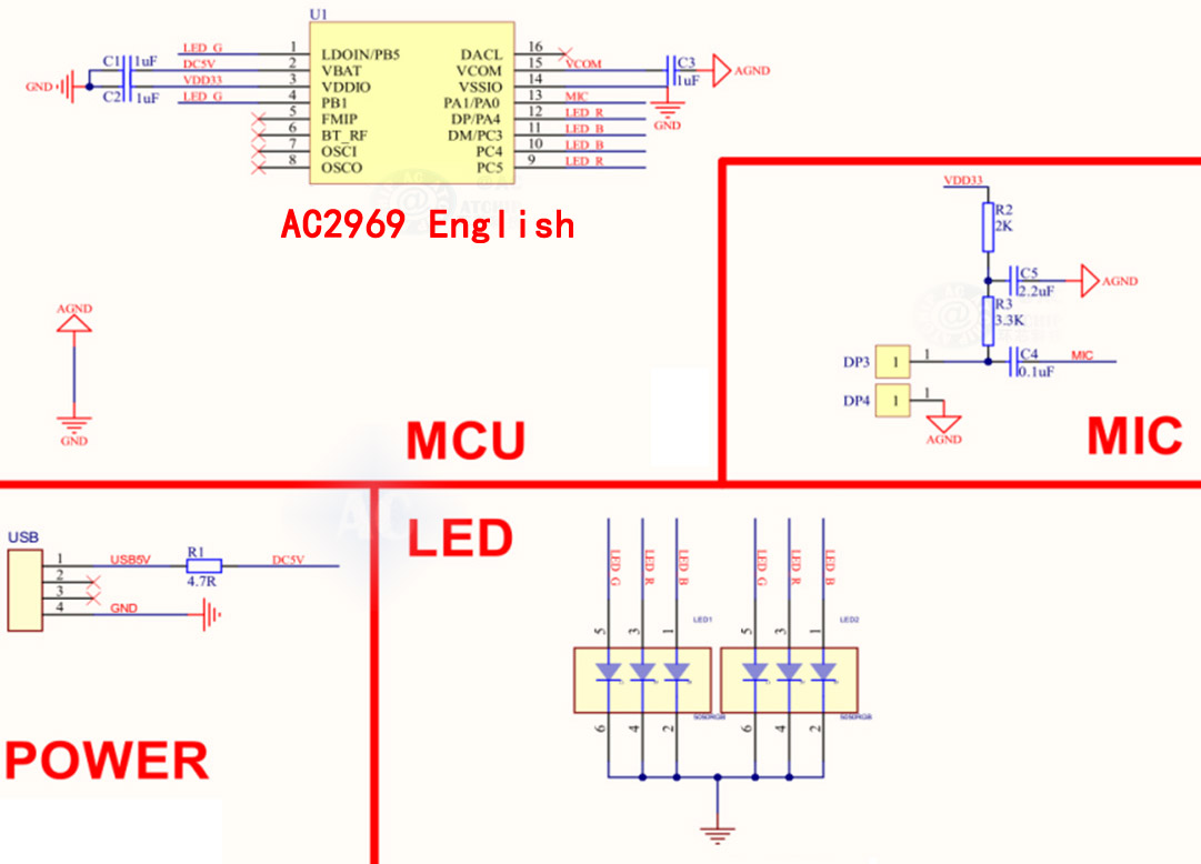 離線語(yǔ)音識(shí)別芯片-小夜燈AC2969英語(yǔ)版方案原理圖: