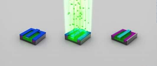清除光刻膠:離子注入完成后,光刻膠也被清除,而注入?yún)^(qū)域(綠色部分)也已摻雜,注入了不同的原子。注意這時候的綠色和之前已經(jīng)有所不同。