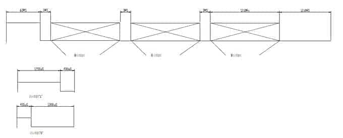 同一命令,也就是同一個命令發(fā)3 次,以下的波形代表一個完整的命令,1200us高+400us為1,400us高+1200us為0, 8位碼需發(fā)送3次,中間間隔低電平3ms,發(fā)完三次后發(fā)送12.8ms低電平收尾 )