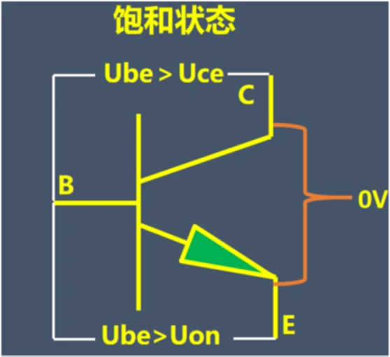 三極管當(dāng)作開(kāi)關(guān)時(shí)其工作在飽和狀態(tài),BE間的電壓要大于開(kāi)啟電壓,同時(shí)BE間的電壓大于CE間的電壓,CE間的電壓可以近似的看成是0。