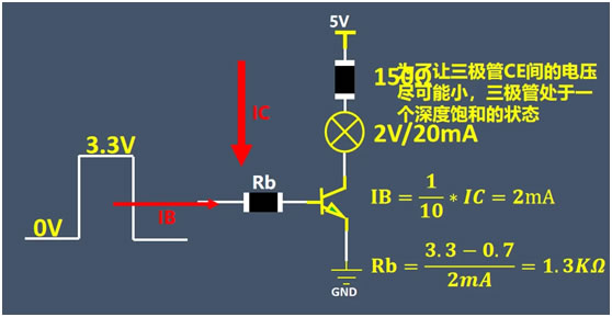 為了讓三極管CE間的電壓盡可能小,三極管處于一個(gè)深度飽和的狀態(tài),一般三極管基極的電流取集電極電流的十分之一,這里也就是2mA,三極管導(dǎo)通電壓取0.7V,所以有Rb為1.3K歐姆。