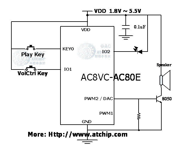 AC8VC標準OTP語音芯片IC接線圖PWM直推喇叭